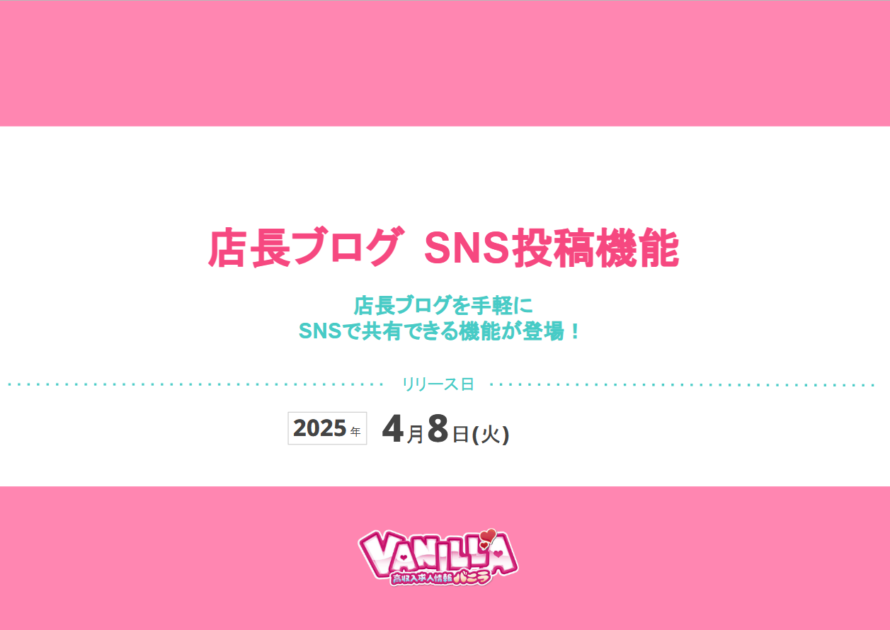 ●この度、高収入求人情報 VANILLA(バニラ)にて、『 店長ブログSNS投稿機能 』をリリースする運びとなりましたので、お知らせさせていただきます。バニラ内の機能『「 店長ブログ 」の更新情報を手軽にSNSに投稿できる新機能 』となります。