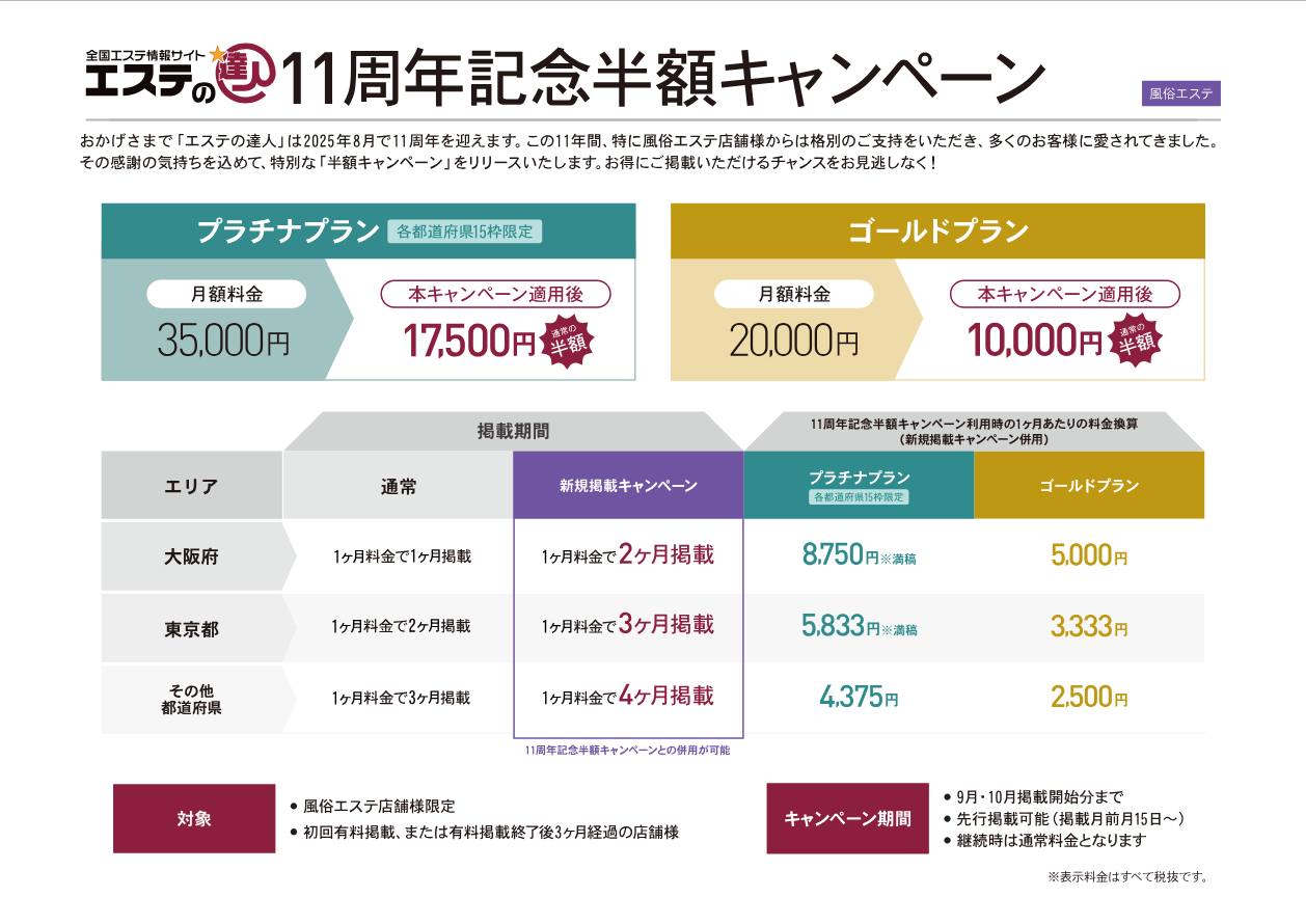 ●風俗エステ店舗様限定で、2025年9月・10月掲載分に限り【 掲載料金が半額 】