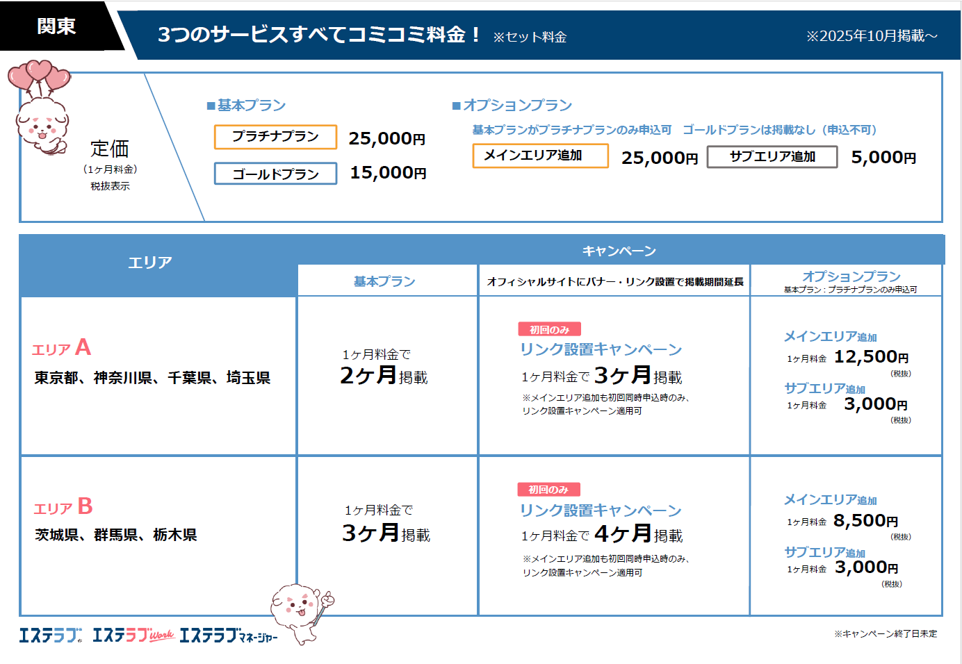 ●この度、エステラブより、10月掲載分からの関東版最新料金表をお送りいたします。8月8日にご案内差し上げましたエリア区分改定が反映されておりますので、ぜひ店舗様へのご提案にご活用ください。