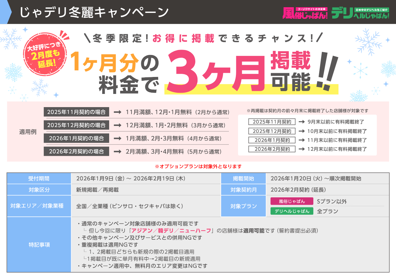 【 風俗じゃぱん・デリヘルじゃぱん:25年版じゃデリ冬麗キャンペーン 延長 】詳細資料