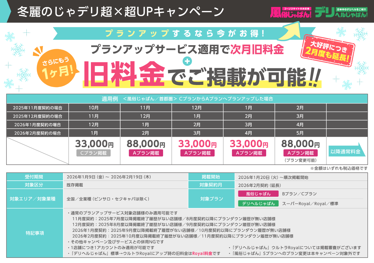 【 風俗じゃぱん・デリヘルじゃぱん:25年版 冬麗のじゃデリ超×超UPキャンペーン 延長 】詳細資料