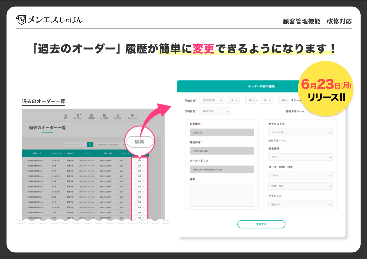 ●この度は、メンエスじゃぱんでは、『 顧客管理機能 』について、店舗様、代理店様よりお寄せいただいたご要望を反映し、