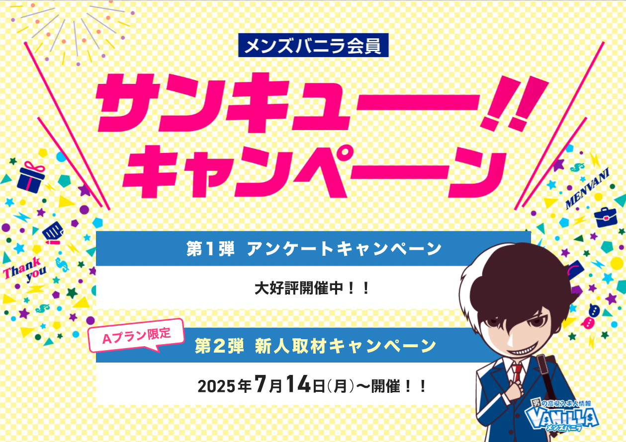 ●本日より、メンズバニラにて、『 サンキューーー!!キャンペーン(第2弾:新人取材キャンペーン) 』を開催いたします!