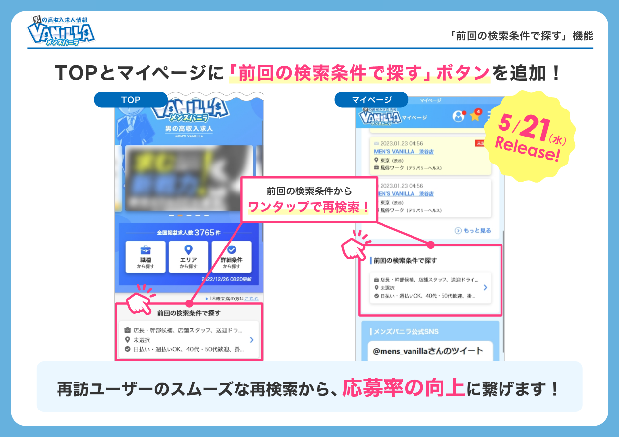 ●メンズバニラにて、『 前回の検索条件で探す 』ボタンを追加いたしましたのでお知らせいたします。