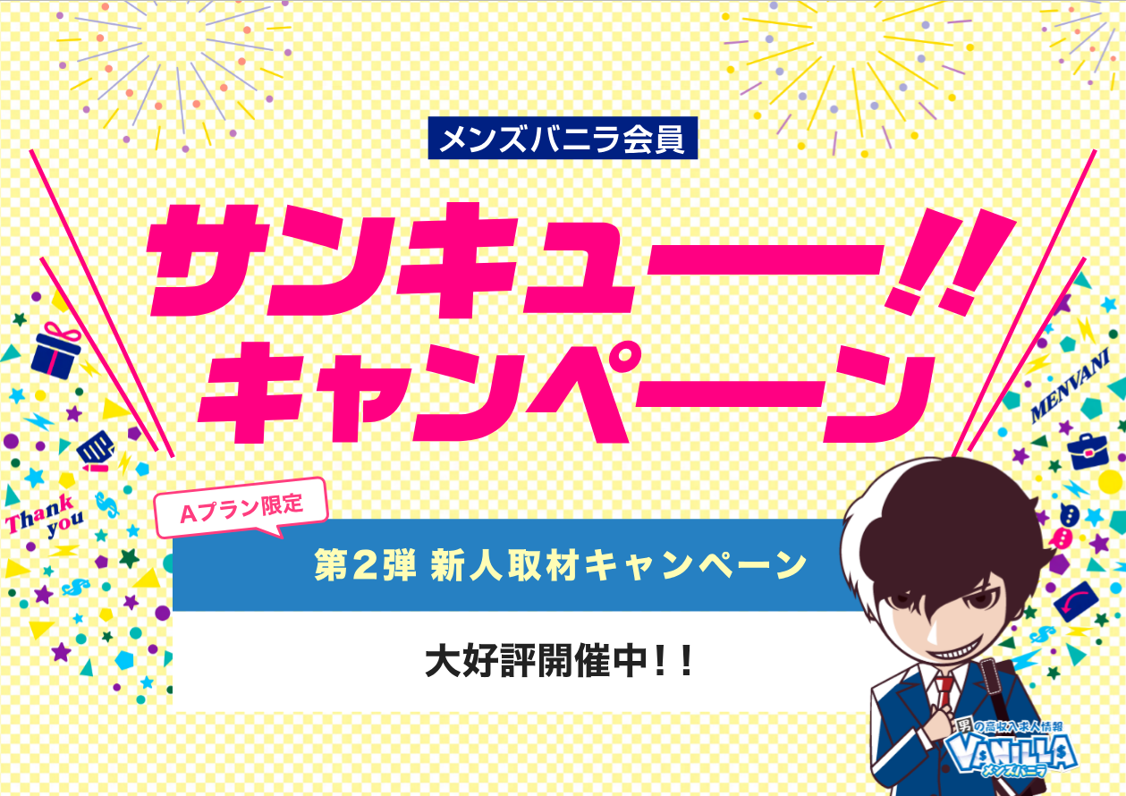●本日より、メンズバニラにて、『 サンキューーー!!キャンペーン(第2弾:新人取材キャンペーン) 』の謝礼金の条件の緩和を行います。また、参考資料に求職者側のキャンペーン参加条件を追記いたしました。