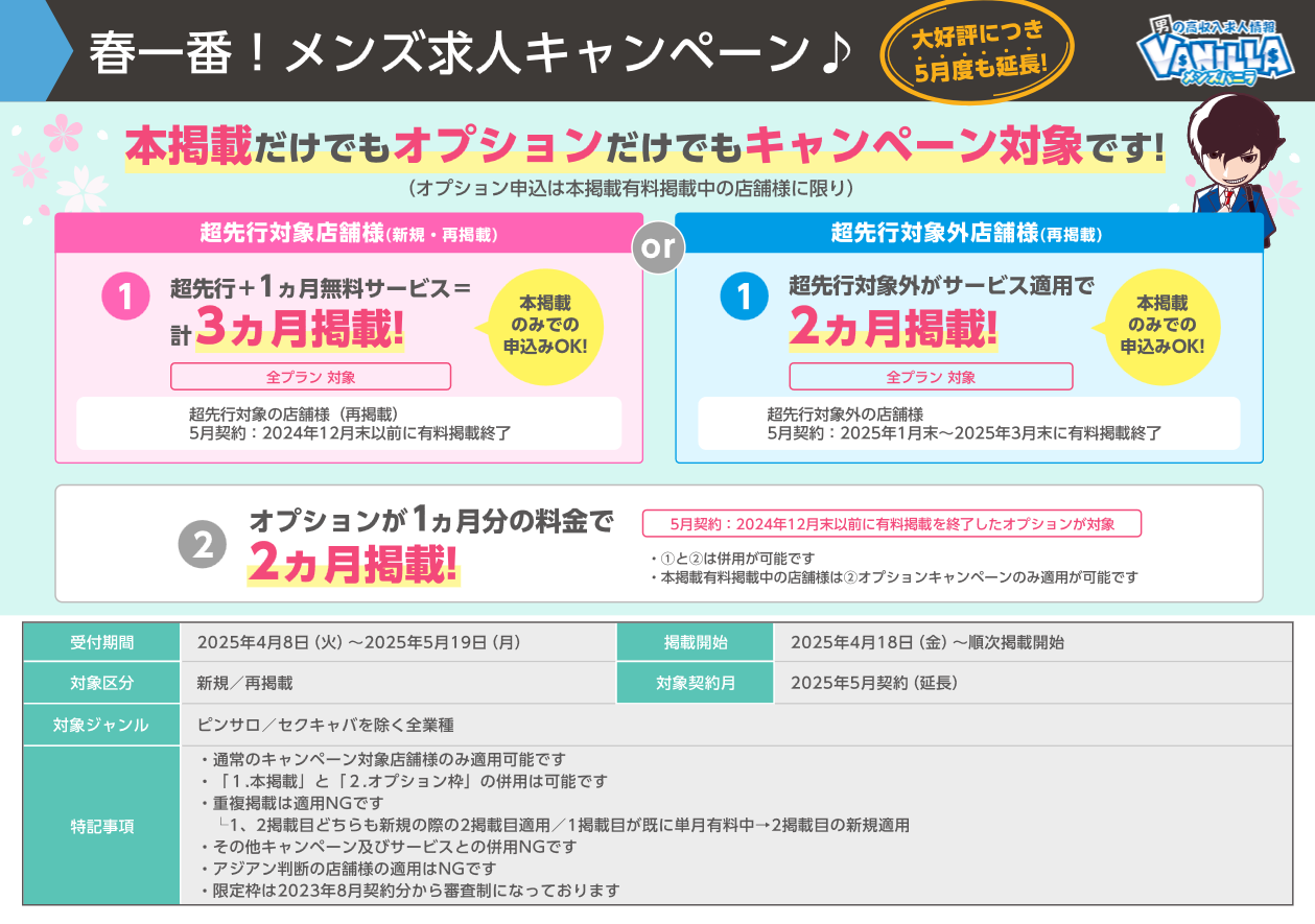 【 メンズバニラ 】『 春一番!メンズ求人キャンペーン(2025年4月契約) 』延長のお知らせ
