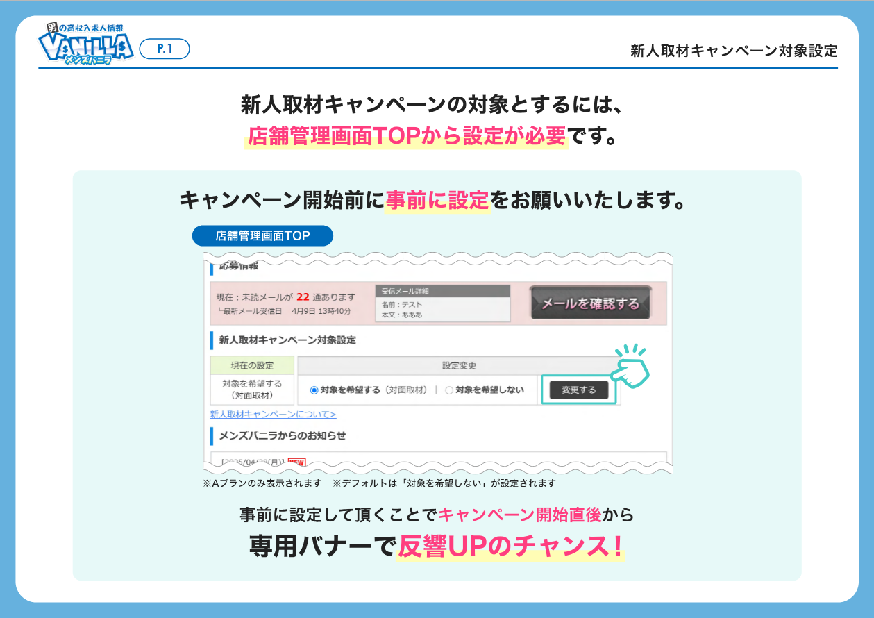 【 メンズバニラ:店舗管理画面「新人取材キャンペーン対象設定」 】詳細資料