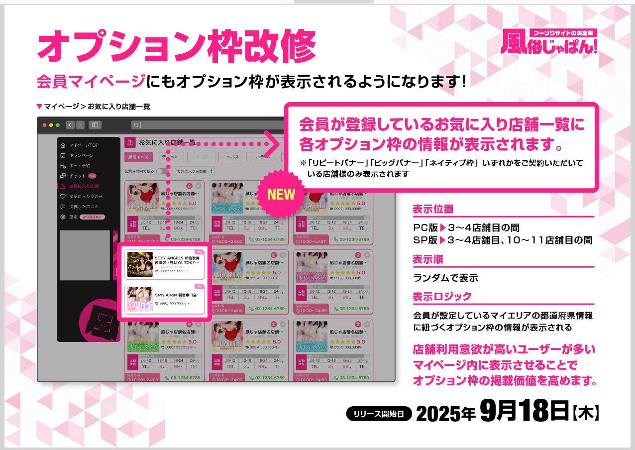 ●この度、風俗じゃぱん!の『 オプション枠 』につきまして、新たにマイページ内の「 お気に入り店舗一覧 」に表示することとなりましたのでお知らせさせていただきます。