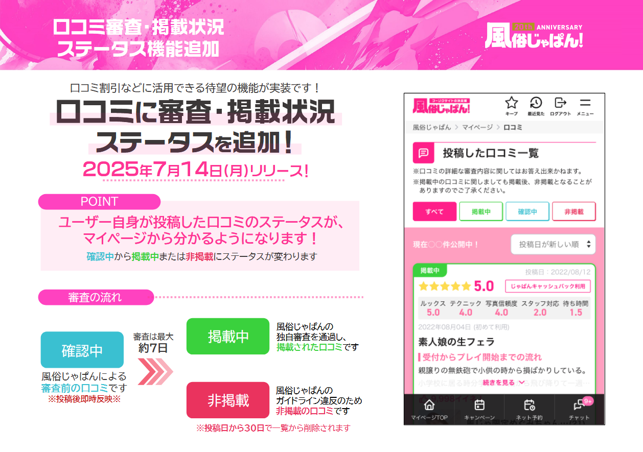 【 風俗じゃぱん:口コミ審査・掲載状況ステータス機能追加 】詳細資料