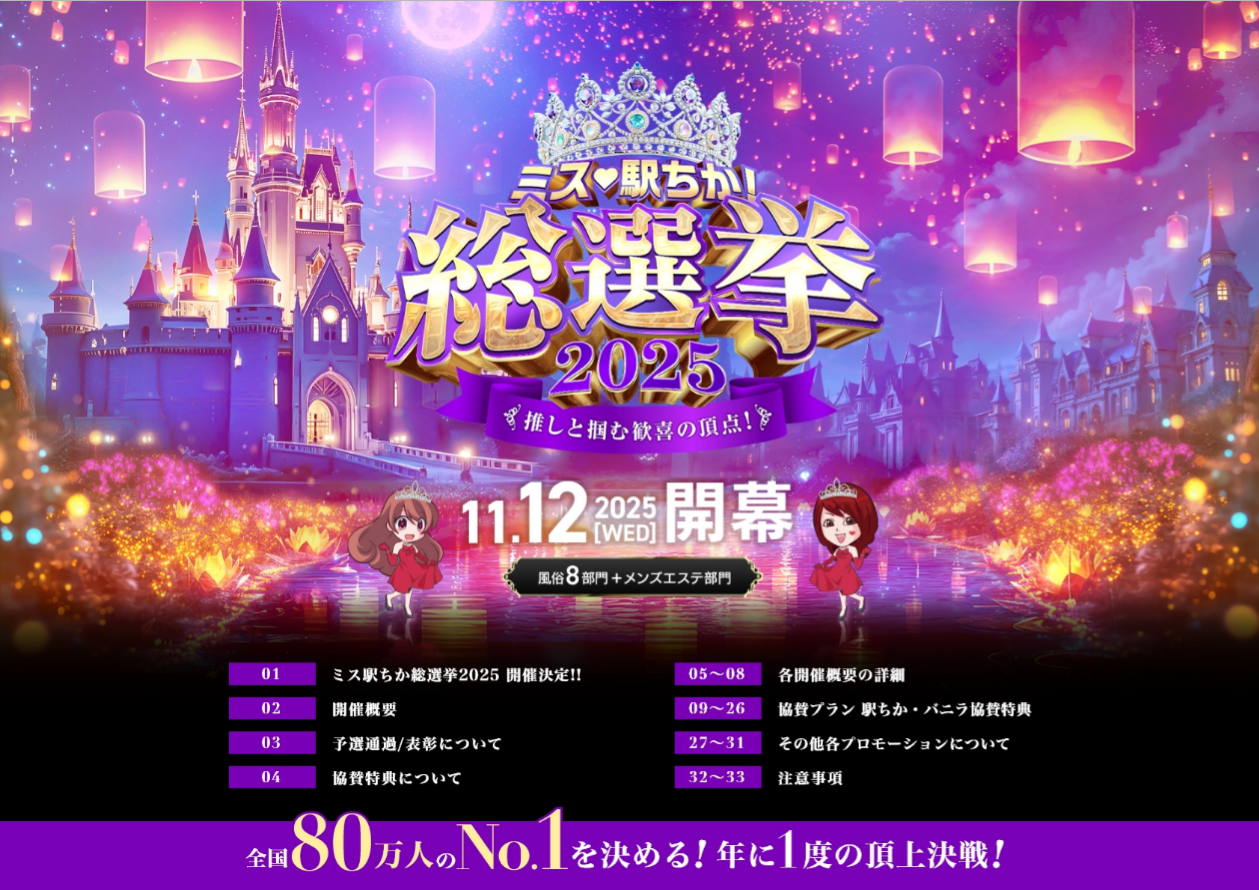 駅ちか人気!風俗ランキングより、『 ミス駅ちか総選挙2025 』全国決勝ページがリリースされました♪全国80万人のNo.1を決める年に1度の頂上決戦ついに開幕!