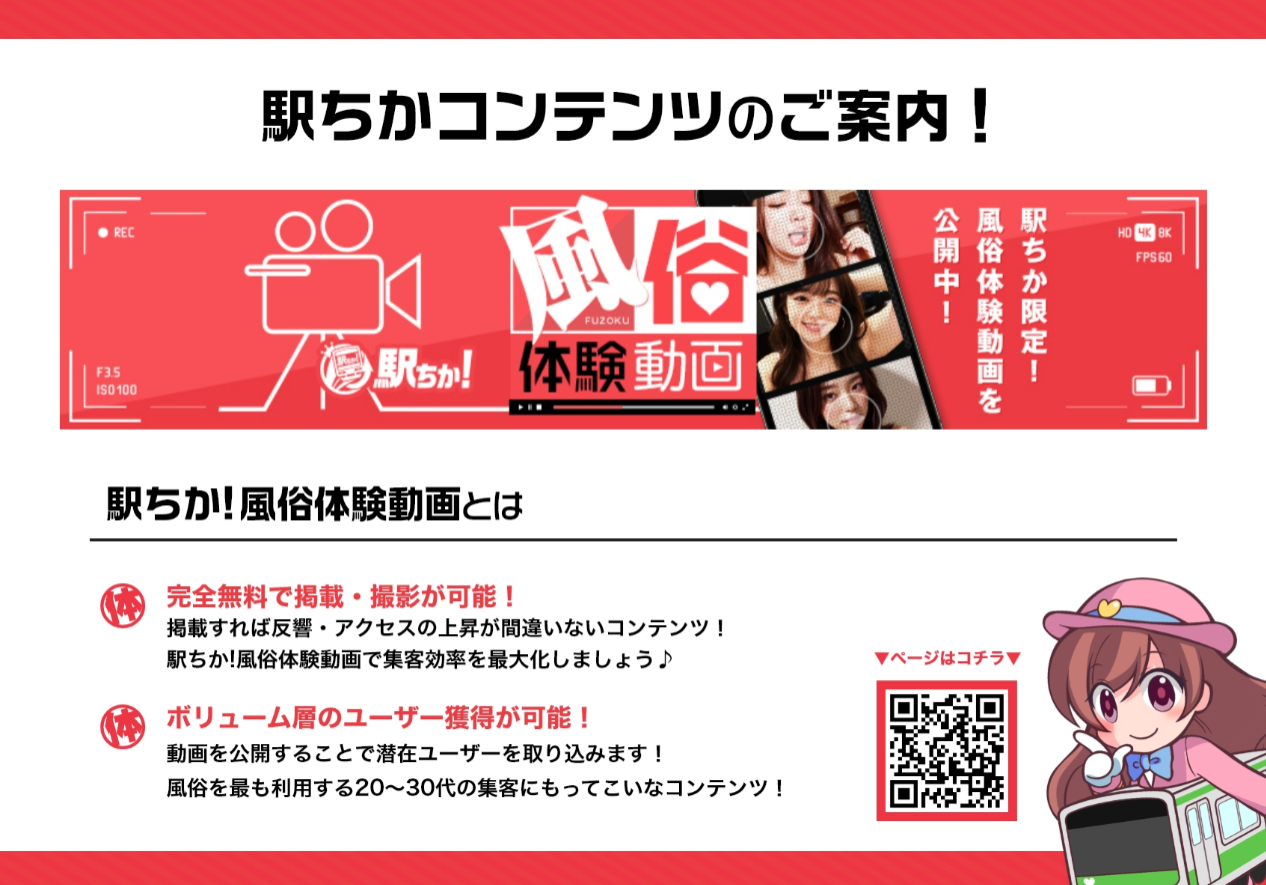 ●この度、駅ちか人気!風俗ランキングより、駅ちか!風俗体験動画の撮影を全国エリアで解禁いたしました!リリース以降関東圏を中心に撮影・公開を行ってきた風俗体験動画ですが、その掲載効果はバツグンで、どの店舗様、女の子もアクセス・反響がアップしております!2025年4月上旬に各都道府県のページを追加し、順次撮影した動画を公開してまいります!