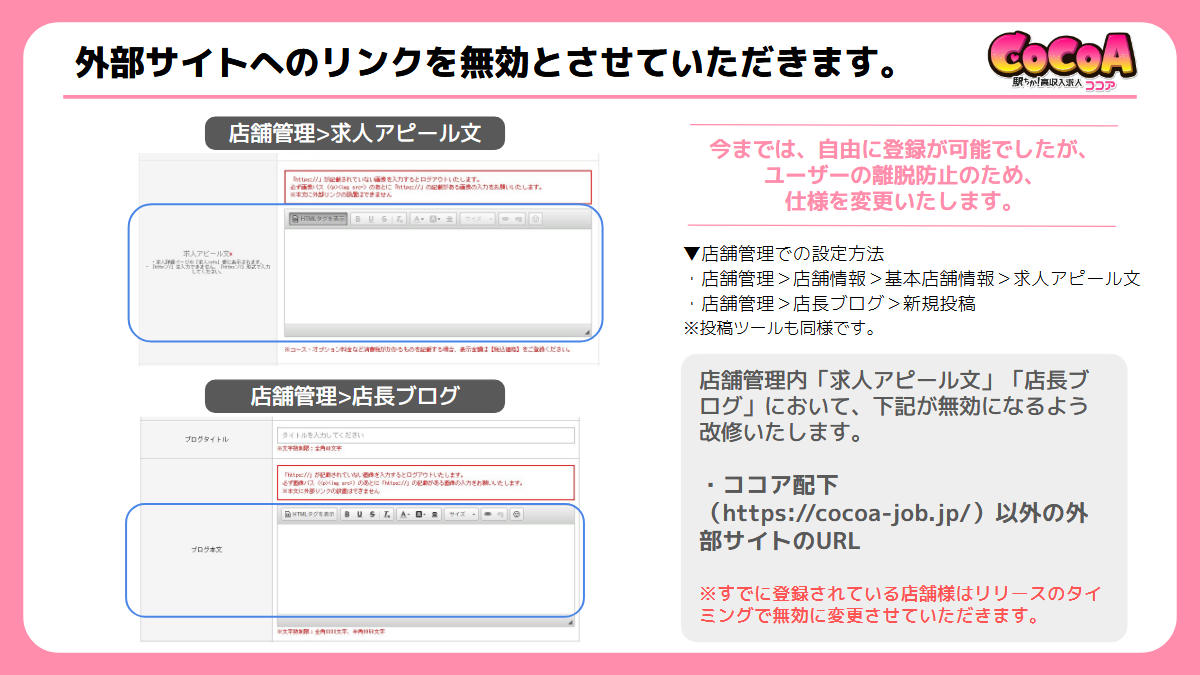 【 駅ちか!風俗求人ココア 】一部コンテンツで『 外部サイトへのリンクを無効 』のお知らせ