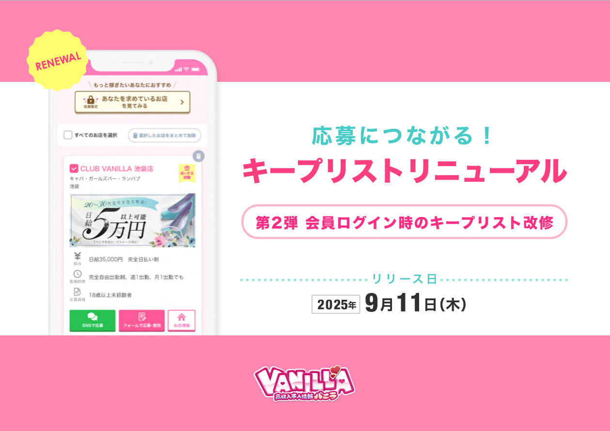 この度、高収入求人情報 VANILLA(バニラ)より、今年3月にリリースした『 キープリスト 』機能改修第1弾に引き続き、第2弾として、『 会員ログイン時のキープリスト 』をリニューアルいたします。