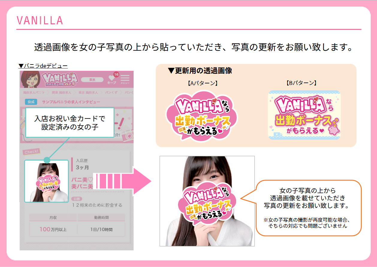 ●この度、高収入求人情報 VANILLA(バニラ)にて、先日ご案内させていただいた『 入店お祝い金キャンペーンの名称及び一部内容変更 』に伴い、下記対応のご協力をお願い致します。