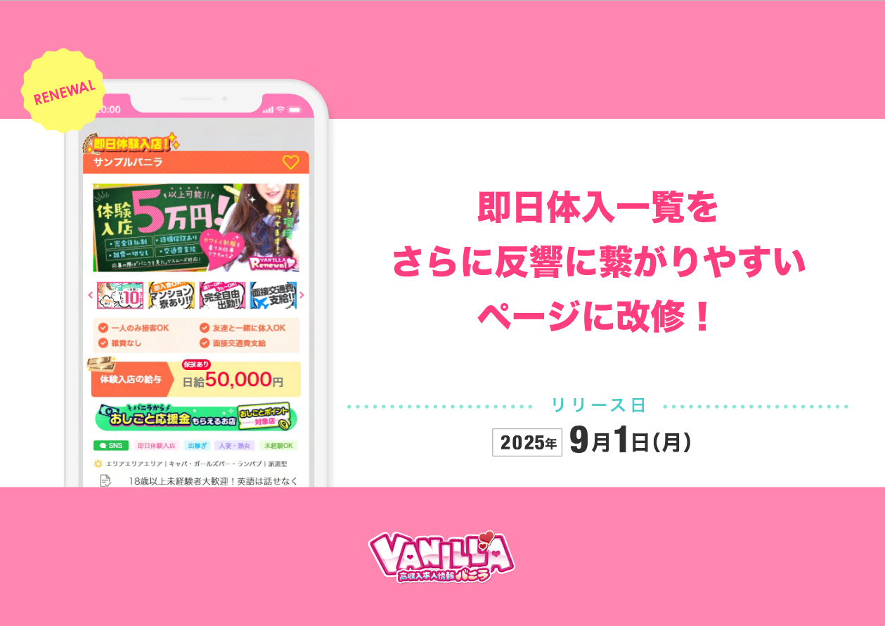 ●この度は、高収入求人情報 VANILLA(バニラ)にて、ご好評いただいている『 即日体入オプション 』につきまして、より一層の反響をお届けできるよう、検索一覧ページの改修を致しますのでお知らせいたします。
