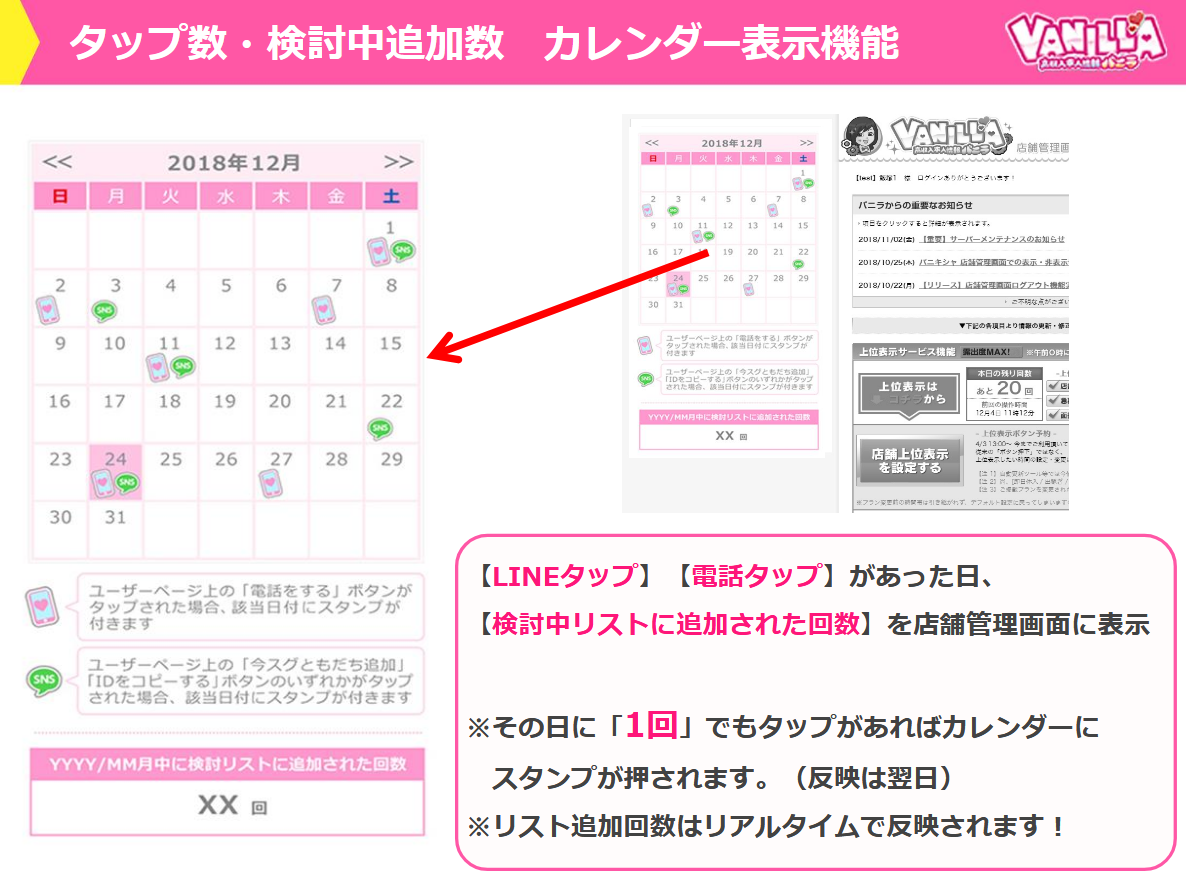 【 バニラ:LINE・電話タップお知らせカレンダー表示エリア追加 】詳細資料