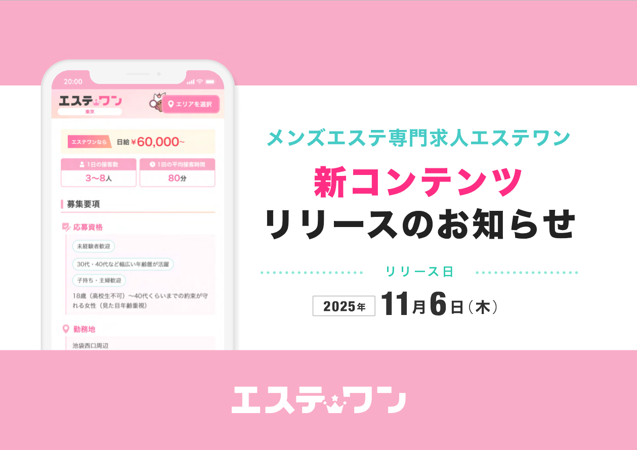 メンズエステ専門求人『 エステワン 』新コンテンツリリースのお知らせになります。
