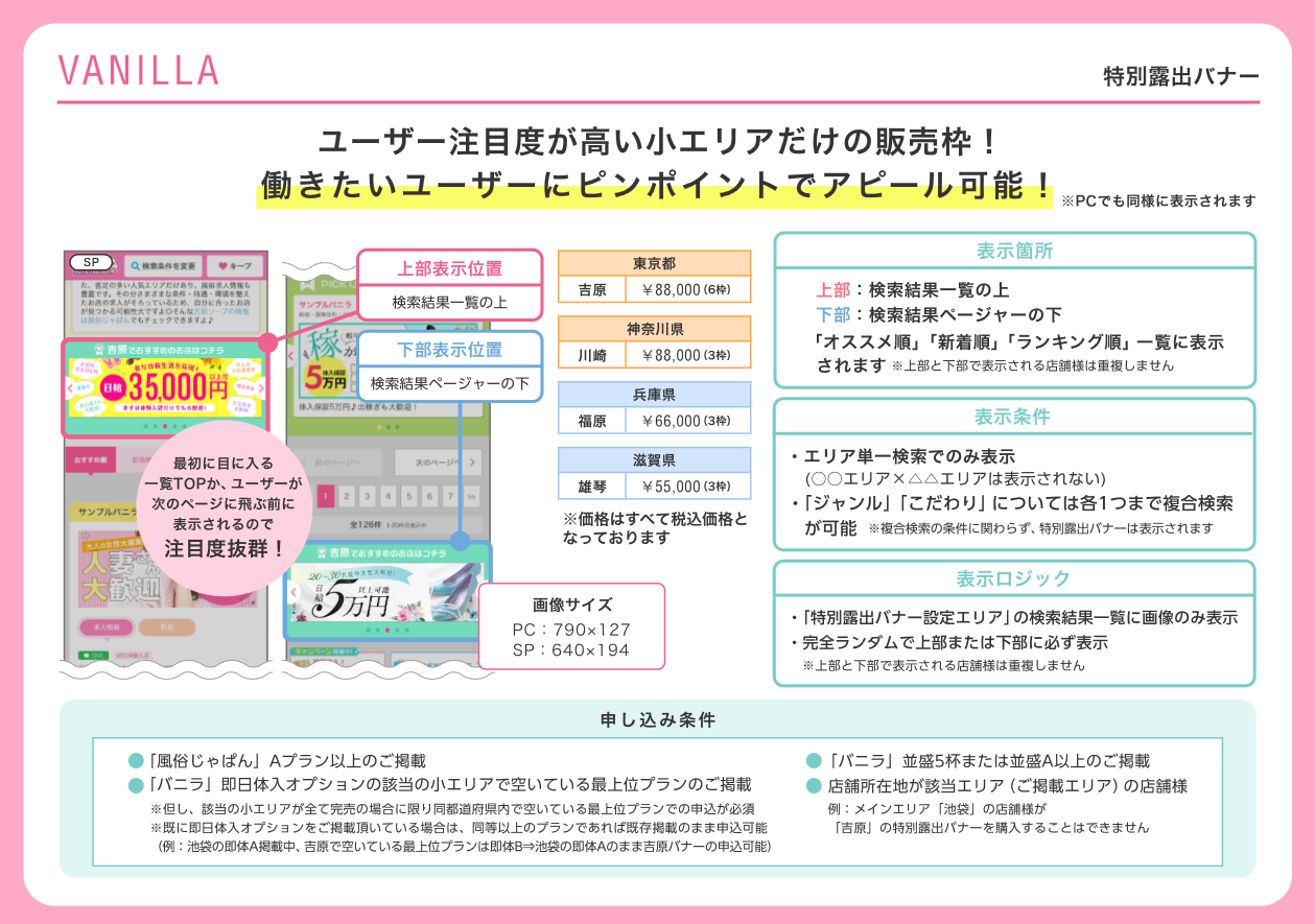 ●高収入求人情報 VANILLA(バニラ)より、『 特別露出バナー 』に関しまして、3月契約分より一部エリアの新設及び増枠をさせていただく運びとなりましたのでお知らせいたします。