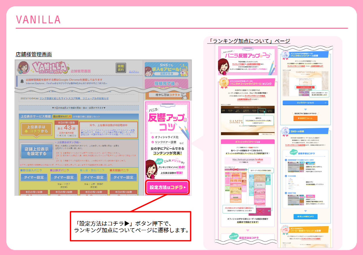 ●この度、高収入求人情報 VANILLA(バニラ)にて、店舗様管理画面の『 ランキング加点について 』ページのデザインを変更いたしました。詳しくは以下をご確認ください。